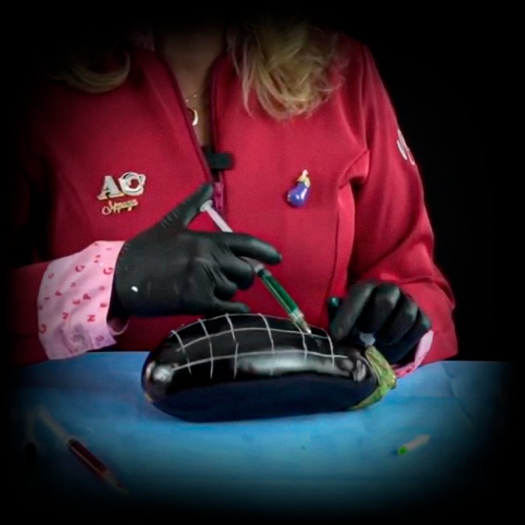 A berinjela é utilizada pois sua textura é a que mais se aproxima da textura da pele humana, sendo assim os futuros especialistas conseguem aprender os pontos de aplicações e tirar dúvidas com o docente responsável pela didática da aula.